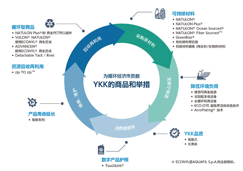 循环经济是指通过维修、再利用、回收等 工艺,最大限度地长久使用现有材料和产品 的持续循环的经济体系。YKK为了助力向这 种可持续经济体系转型,正全力推进研发新 的商品和技术,包括有转换为拉链布带部分 使用再生材制作的NATULON®系列 ;2024 年秋季发布的“易修系列”;支持为便于使用 后回收而最大限度采用由PET材料制成的PET 服装回收专用拉链等。 此外,我们启动了名为“zip TO zipTM” 的举措——将以往被废弃的发斯宁产品回收 再造为全新的发斯宁产品