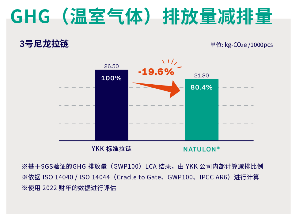 在服装制造的整个供应链中,降低环境负荷已成为行业共同的课题。在此背景下,NATULON® 是拉链的布带部分采用源自废弃物的再生材料制造而成。这种活用再生材料的做法,是有助于减少使用源自新石油的资源的举措之一。此外,从生产拉链时的环境负荷(LCA)数值来看,No.3闭口20cm的NATULON® 尼龙拉链与普通的YKK尼龙拉链相比,可削减约19.6%的温室效应气体(GHG)。