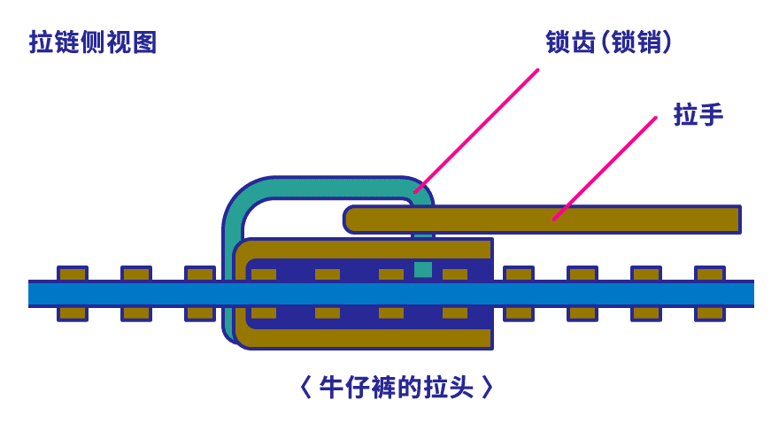 以牛仔裤等衣物中使用的拉头为例。穿着牛仔裤时若将拉手向下压,名为锁齿(锁销)的部分就会与拉链齿咬合,从而防止拉链意外开合。