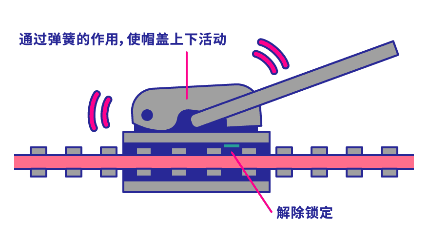 比如说,这种类型的话,拉头的上表面(帽盖)具有类似弹簧的功能,提起拉手时整体便会抬升从而解除锁定。若不提起拉手,则始终保持锁定状态。