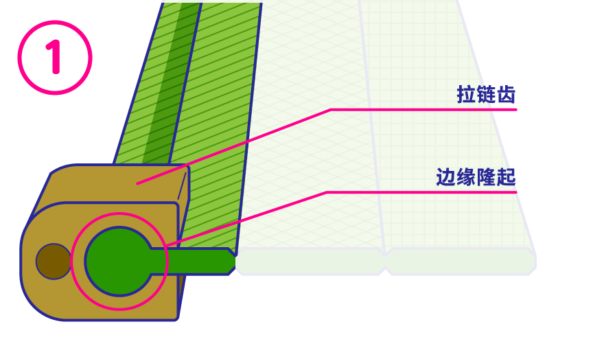 与拉链齿接合之处,其边缘部分会像绳子那样隆起,以便能够牢固安装。