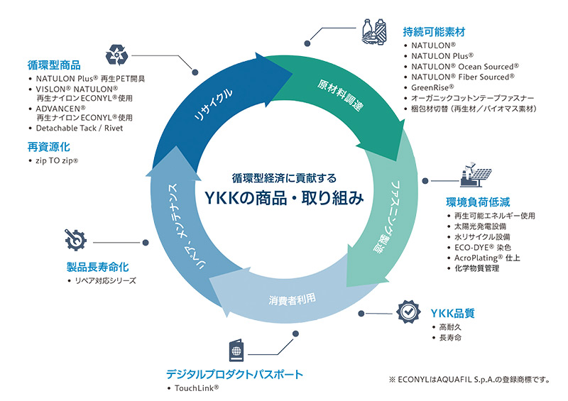 サーキュラーエコノミーとは、既存の材料や製品ができるだけ長く活用され、リペア、リユース、リサイクルなどのプロセスを通じて循環し続ける経済システムです。YKKは、この持続可能な経済システムへの移行に貢献すべく、ファスナーのテープ部分に再生材を使用したNATULON® シリーズへの切り替えや、2024年秋に発表した「リペア対応シリーズ」、使用後のリサイクルを想定して可能な限りPET材料を使用したPETガーメントリサイクル対応ファスナーなどの新たな商品・技術開発に注力しています。また、これまで廃棄されていたファスニング製品を再利用して新たなファスニング製品に生まれ変わらせる zip TO zip® という取り組みを開始しました。