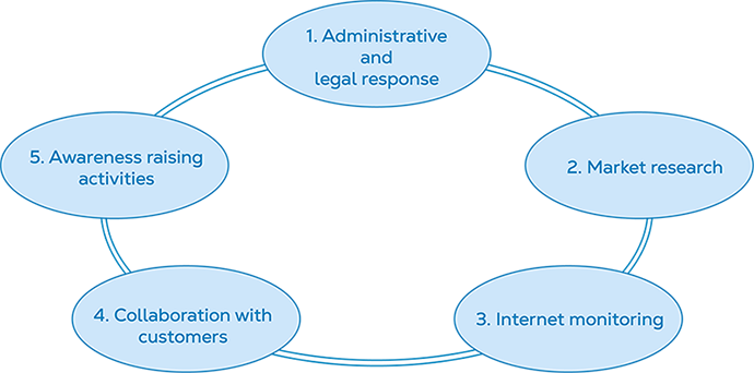 We collaborate with administrative bodies such as customs authorities to halt the distribution of counterfeit products and expose such activities, taking legal action–including litigation–where necessary.