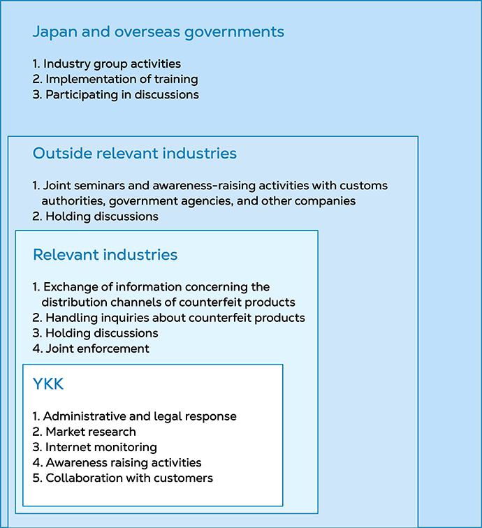 The issue of counterfeit products will spread across borders. Through injunctions at customs points, joint seminars, and cooperation with overseas authorities, YKK is actively promoting the elimination of counterfeit products worldwide.