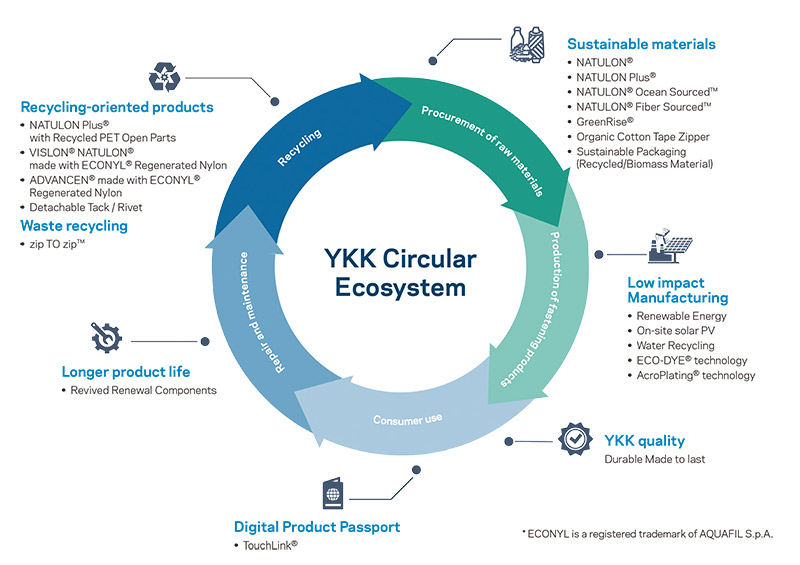 A circular economy is an economic system in which existing materials and products are utilized as long as possible, and continue to circulate through processes such as being repaired, reused, and recycled. In order to contribute to the transition to this sustainable economic system, YKK is focusing on developing new products and technologies, such as switching to the NATULON® zipper series which uses recycled material in the zipper tape segment, the Revived Renewal Components which were announced in the fall of 2024, and a zipper for PET garment recycling, made from PET materials as much as possible, with recycling after use in mind. We have also launched zip TO zipTM, an initiative to reuse discarded fastening products and transform them into new fastening ones.