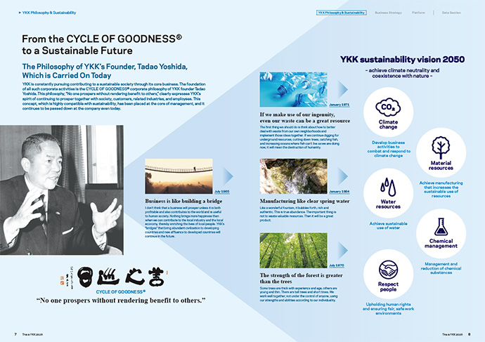The integrated report “This is YKK” presents a comprehensive story of long-term, sustainable value creation in the Fastening Business, along with the medium-term business strategy and progress on sustainability initiatives. This narrative is grounded in the YKK philosophy and founding spirit of Tadashi Yoshida, which has been continuously passed down from the company's inception to the present day.