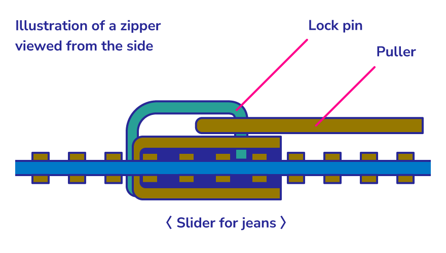An example is the case of sliders used on items such as jeans. When wearing jeans, if you keep the puller down, a part called the lock pin catches on the elements, preventing the zipper from opening or closing.