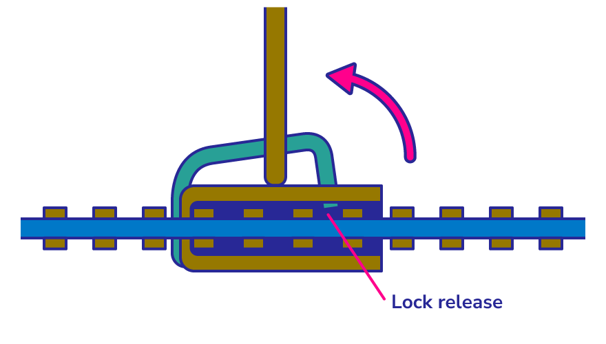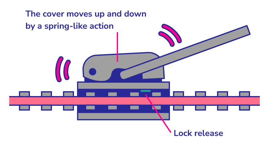 For example with this type, The top surface (cover) of the slider has a spring-like mechanism; when the puller is held, the entire slider lifts up and the lock releases. The lock stays engaged unless the puller is held.