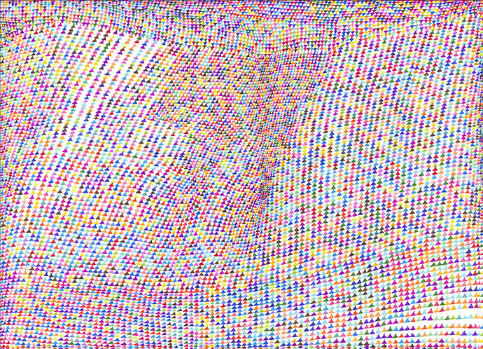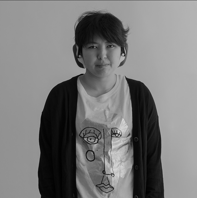 学校に行けず暇を持て余していた時期に、作家の母が「マルを描いて」と紙とペンを渡したのが彼女の創作のはじまり。マルというモチーフが彼女のなかでピタリとはまり熱中するようになる。マルを描き始めて5年になるが、近年はマル以外のモチーフも描くようになり、マル、サンカク、シカクのモチーフを大きなカンバスに日々飽きることなく描き続ける。コミュニケーションとして発する言葉はわずかだが、頭に浮かんだであろう言葉を繰り返し呟き、言葉と一緒に作品が生まれることもある。