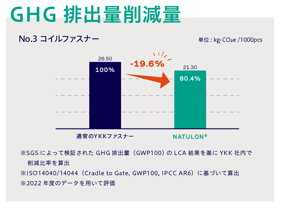 衣料品製造のサプライチェーン全体で環境負荷低減が業界共通の課題となる中、NATULON® はテープ部分に廃棄物由来の再生材を用いて製造されています。こうした再生材の活用は、新規石油由来資源の使用低減に寄与するための取り組みの一つです。また、ファスナー製造時における環境負荷(LCA)数値において、No.3止20cmのNATULON® コイルファスナーは、通常のYKKコイルファスナーと比較して温室効果ガス(GHG)を約19.6%削減することが示されています。