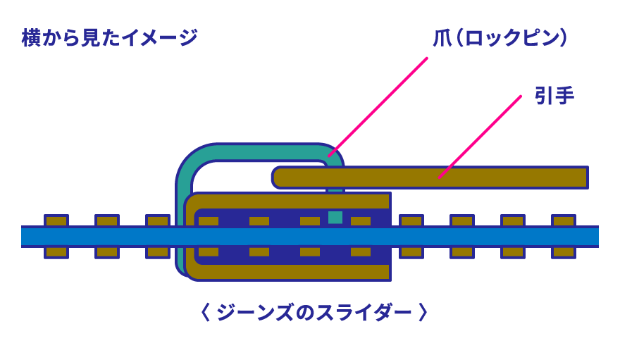 たとえばジーンズなどに使われるスライダーの場合。ジーンズを履いているときに引手を倒しておくと、爪(ロックピン)と呼ばれる部分がエレメントにひっかかって、ファスナーが開閉しないようになっています。
