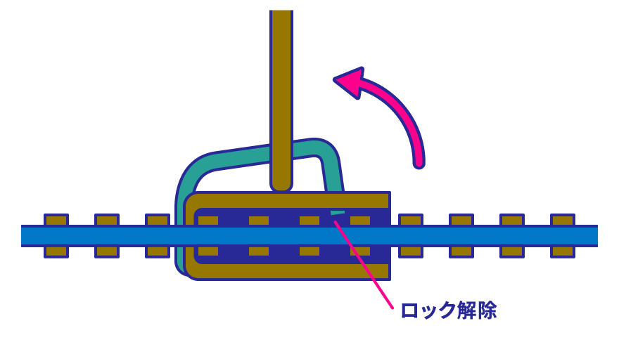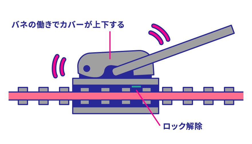 例えばこちらのタイプだと、スライダーの上面(カバー)にバネのような働きがあって、引手を持つと全体が浮き上がり、ロックが外れるのです。引手を持たなければロックが効いている状態になります。