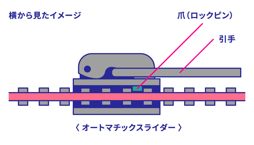 スライダーの内部に仕掛けが隠されていて、引手の動きと連動してロックが作動するしくみになっています。